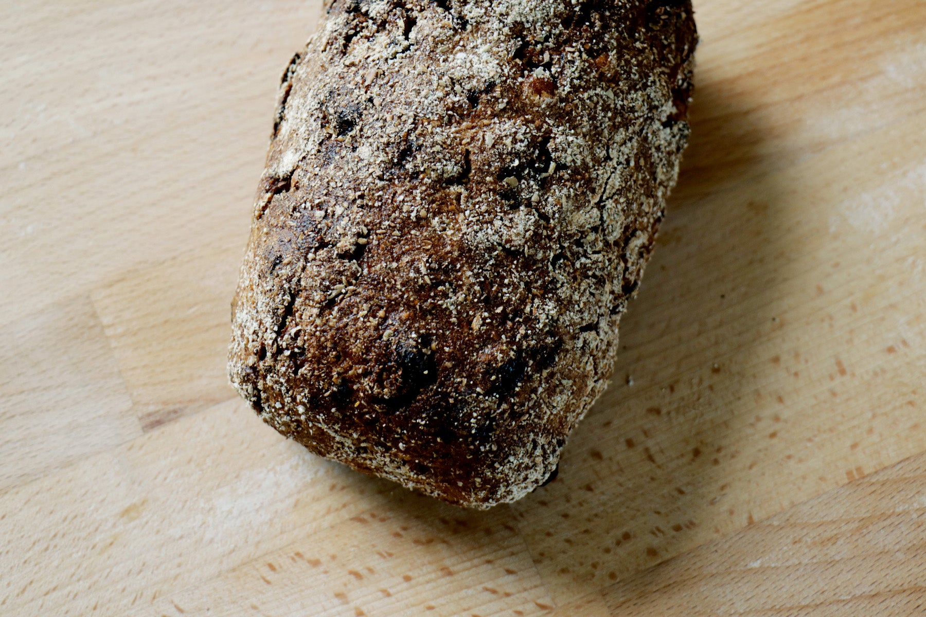 Zutaten: Roggenvollkornnatursauerteig**, Feigen**, Sultaninen**, Wasser, Roggenvollkornmehl**, Haselnüsse*, Roggenmehl**, Zitronenschale*, Orangenschale*, Steinsalz, Gewürze*